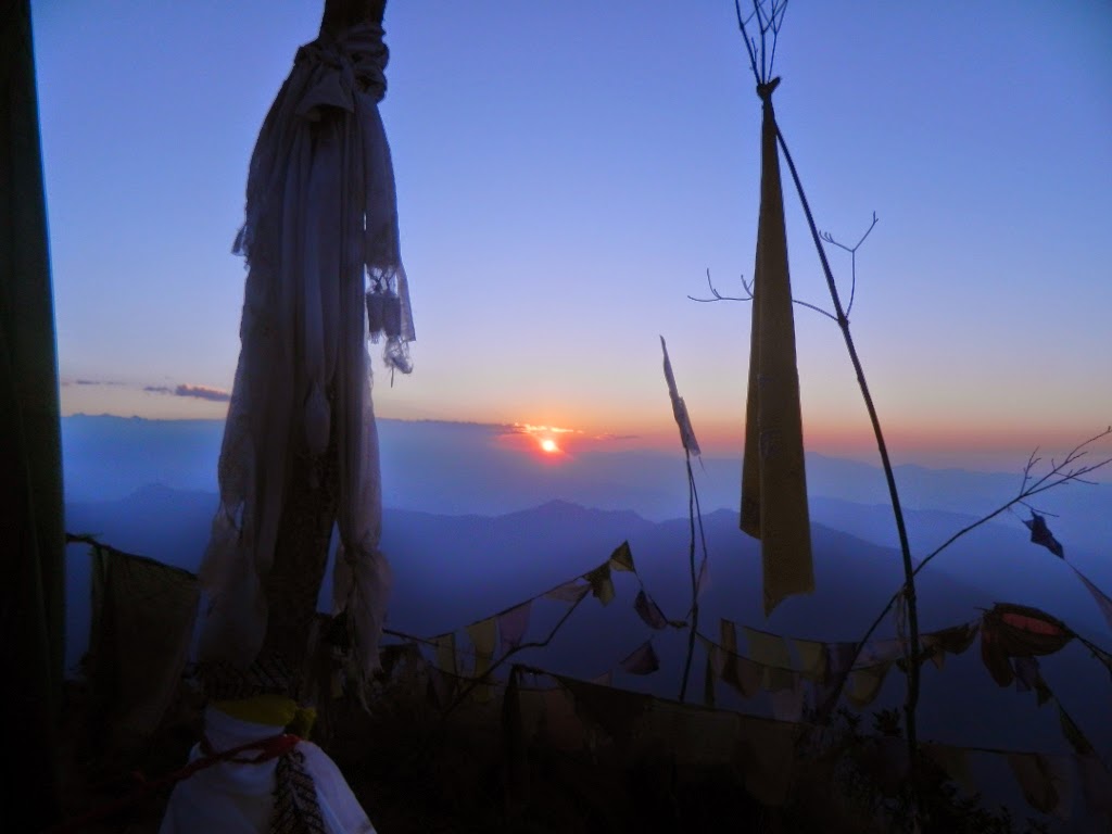 Next morning we hiked another 2-3km. to Bhaleydunga - the sunrise point, to observe first rays on the snowy peaks. Witnessing an unparalleled sunrise over the mountains and silvery peaks turning into reddish and then golden, we felt blessed for the second time. At Bhaleydunga there was an open air temple-cum-monastery where we tied a Tibetan prayer flag and prayed for removing evil spirit from everyone's life. I dare say that here, the place of worshipping, is actually made to bow down in front the supreme Lord, the creator of this astounding beauty. We kneeled down to touch our head on this sacred soil and departed for Ravang with lots of memories to reminiscence later.